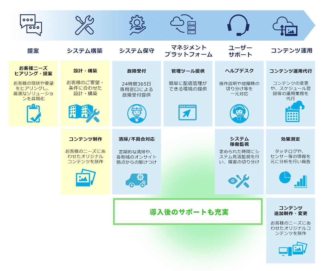 導入時のコンサルティングから運用・効果測定に至るまで、デジタルサイネージの活用に必要とされる機能をワンストップでトータルに提供します。
